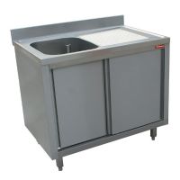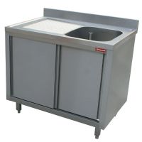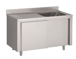 Typology : avec portes coulissantes Dimensions (mm) : 800x700x850 mm Plan de travail en acier avec dosseret de 40 mm d’épaisseur Dosseret h 100 mm Avec panneau de couverture de la cuve et portes coulissantes